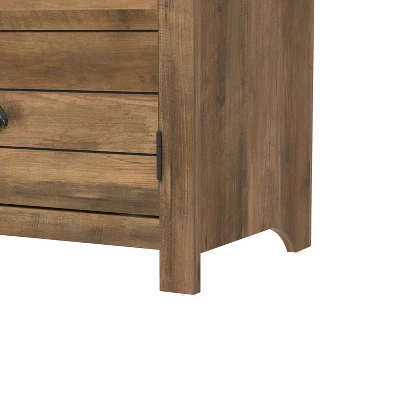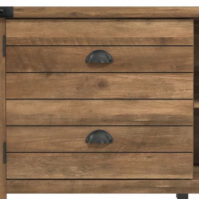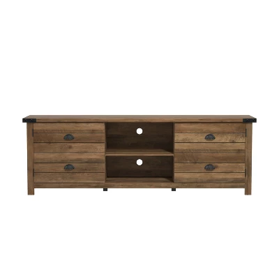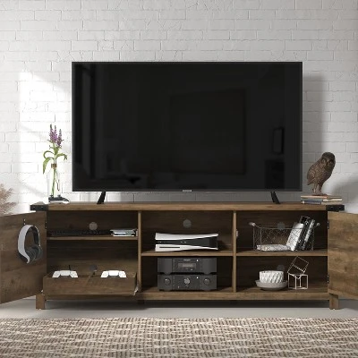 Bring a natural, earthy focal point to your living room with this farmhouse-inspired 70-inch TV stand. Crafted from high-grade engineered wood, this gaming-ready TV stand boasts adjustable shelves with two doors for out-of-sight controller, headset, and hardware storage. Two central open shelves provide ample space for electronics and gaming consoles while built-in cord management ports keep cables nice and tidy behind the scenes. The versatile rustic oak finish brings a warm, welcoming feel to any space. Assembly required.