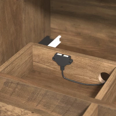 - Gaming-ready wood TV stand with USB port in a rustic oak finish