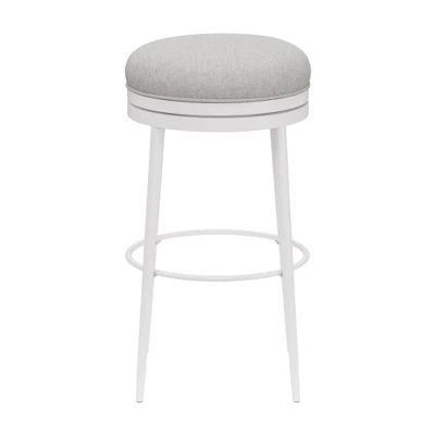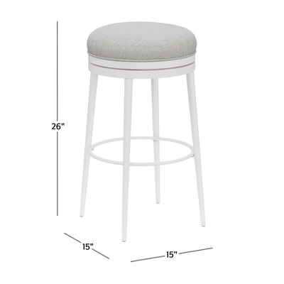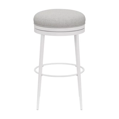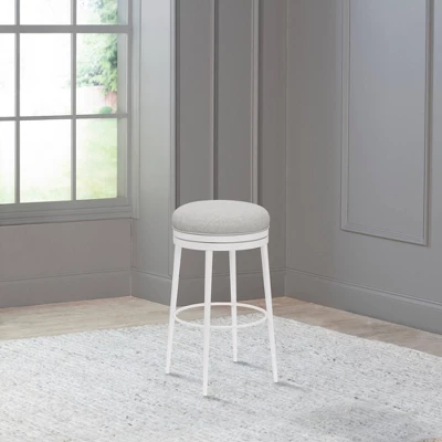 Comfy? Yep. Cute? Adorable. Sturdy? It’s built to last. The Aubrie Off White Metal Counter Height Stool checks every box, with contemporary style and grace. Make a simple yet strong statement, with finely tapered legs, matte off white finish, and neutral light gray fabric. The round pouf seat and perfectly placed footrest invite you to lounge while the 360 swivel makes it easy to get moving. Easily tuck in this backless stool to keep your look clean. You’ll make lasting memories with the double ring base, strong steel, and durable upholstery. Assembly required.