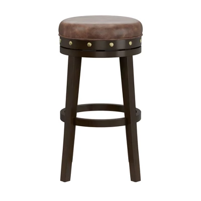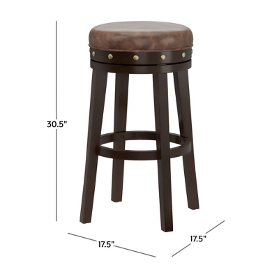 - Smoke Brown, backless wood bar stool, featuring a round, 360° swivel seat with Deep Brown faux leather upholstery and oversized nail head trim