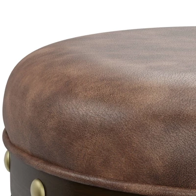 - The round 360 degree swivel seat is upholstered in a weathered dark brown faux leather