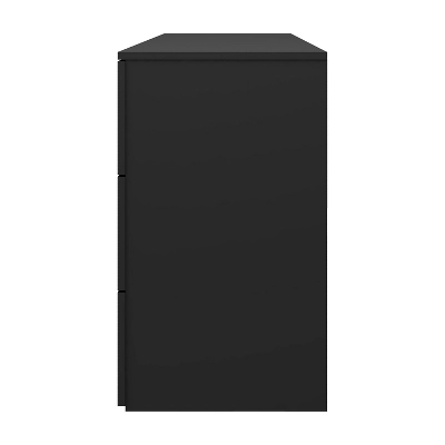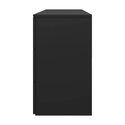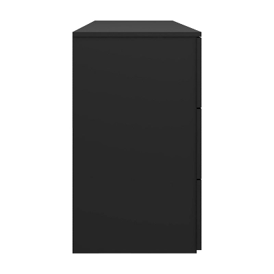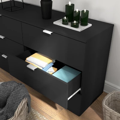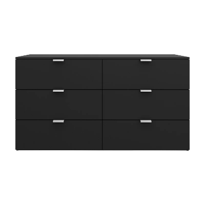 This Wood 6-Drawer Black Dresser simply doesn’t mess around. The no-nonsense look says I take my job seriously – and what a job it does! The six full-size drawers are set on smooth metal glides so you can get in and out without fuss. The streamlined silver handles do clean work, giving you a modern rectangular pull that stays out of the way when not needed. A bold, matte black veneer coating keeps the finish protected and looks great doing it. This bedroom dresser needs no legs to support its work, saving you the hassle of cleaning under it. Assembly required.