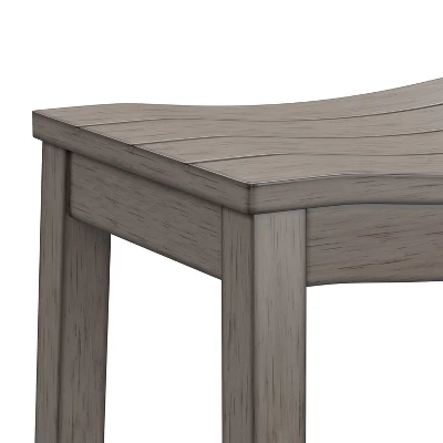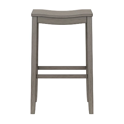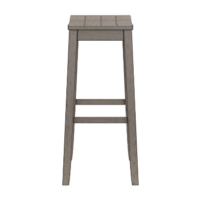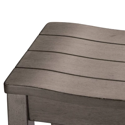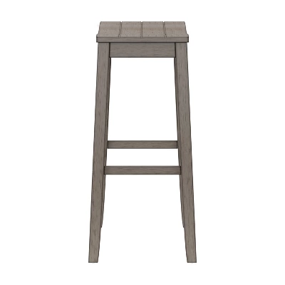 Whether you prefer a sunny, sandy beach or a windy, rocky shore, you’ll love the coastal charm of this bar height stool. Versatile and on-trend, this backless bar stool features a wide, perfectly curved shiplap saddle seat for maximum comfort. The aged gray finish is reminiscent of a soothing summer rain in a quaint coastal town and is an easy addition to any decor. Durable wood flared legs add extra support and are complemented by perfectly a placed footrest adding an extra layer of comfort while eating, entertaining or working. Assembly is required.
