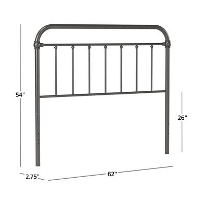 The Kirkland headboard brings the Industrial Farmhouse style to life with a classic rounded square design. This metal headboard can be used as a full or queen size. It has a simple elegance that will compliment a multitude of dĂ©cor styles. The headboard’s aged pewter finish will help to elevate the design of any bedroom. The combination of castings and spindle pattern throughout offers a look of subtle strength. Frame, box spring and mattress required; not included. Assembly required.