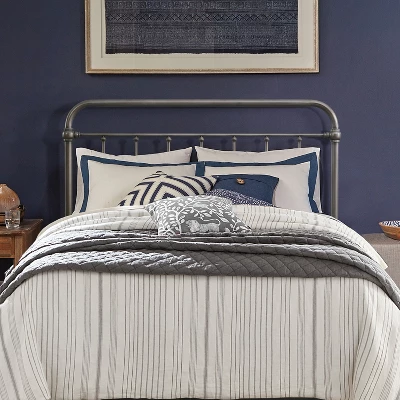 - Casual style full or queen metal headboard in an aged pewter finish