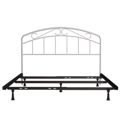 Boasting a traditional design, this arched scroll metal headboard features a platform design with scroll detailing. The combination of spindle bars and graceful scrollwork creates an aesthetic that’s ideal in lodge and country cottage décor schemes. Finished in white to blend nicely with most color palettes. This headboard includes everything you need to update your bedroom style: headboard and frame. Mattress and box spring required; not included. Assembly required.