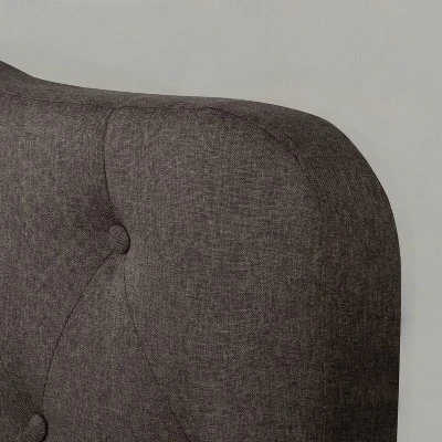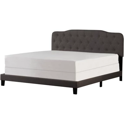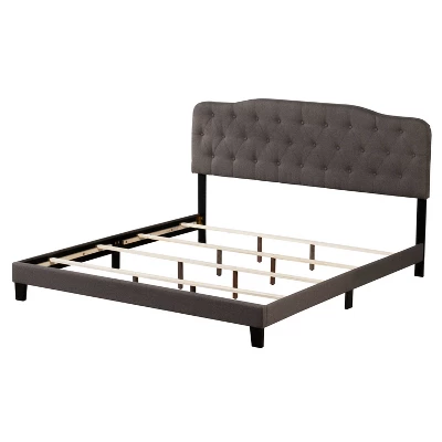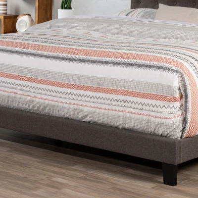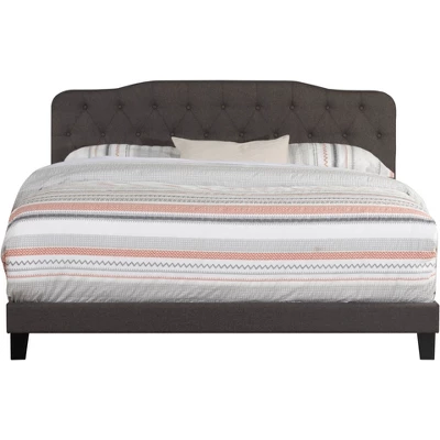 The Hillsdale Furniture Nicole Upholstered Queen Upholstered Bed features an elegantly rounded arched headboard complimented by diamond button tufting details with perfectly coordinated low profile upholstered side rails and footboard. The Stone Gray fabric is simple and neutral and is accented by the dark wood feed. Includes headboard, footboard, and side rails. Mattress and box spring required; not included. Assembly required.