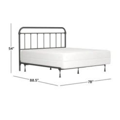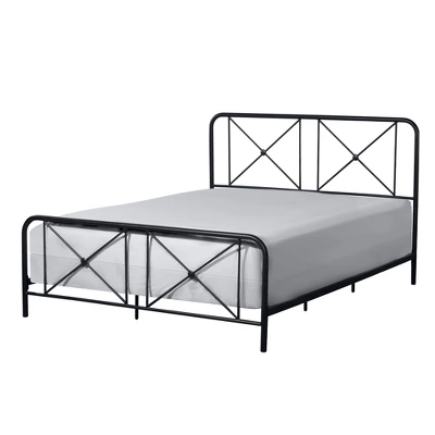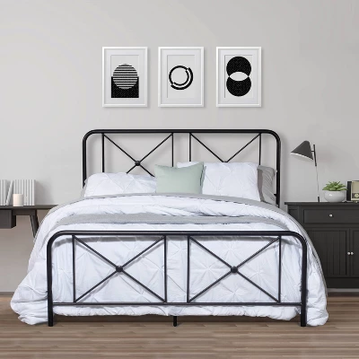With simple lines and an open, airy design this queen metal bed with a decorative Double X Design is the perfect back drop to your bedroom. The soft arches and perfectly placed cast detailing in the X-shaped stretchers in the headboard and footboard creates depth and a touch of class. The classic metal frame is accented by a black finish with a hint of sparkle. Ships in one box; includes headboard, footboard and slat support system; Mattress and box spring required, not included. Assembly required.