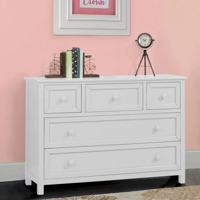 The Schoolhouse 4.0 five drawer dresser has style and sensibility that grows with your child. This dresser is the perfect fit for organizing, designing or maximizing space in your youth or guest bedroom with generously sized drawer space that offers impressive amounts of storage and style. Manufactured with solid wood and veneers, this piece will last for years to come. The bright white finish adds a simple eye appealing look. Assembly required.