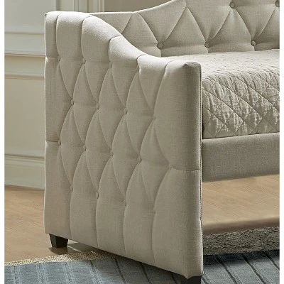 The Jamie Button-Tufted Daybed by Hillsdale Furniture features a classic curved silhouette and that will pair nicely with your chic transitional decor. The daybed is upholstered in a beige linen fabric to give your bedroom a look of traditional elegance. The classic design comes in a space-saving package to add extra sleep space and style all at once. Spot clean with a clean, damp cloth. Standard twin size mattress is required; not included. Some assembly required.